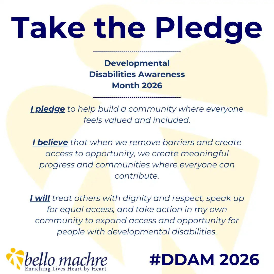 We’re inviting everyone to take the Bello Machre Pledge — a commitment to strengthening the community that makes growth and opportunity possible for people with developmental disabilities.